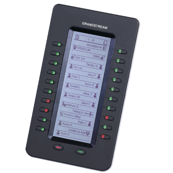 El módulo Grandstream GXP2200EXT cuenta con una pantalla gráfica LCD de 128 x 384 y 20 botones programables (cada uno con LED bicolor). Permite hasta 40 extensiones por módulo usando las dos teclas de cambio de página y hasta 160 botones cuando los 4 módulos de extensión están conectados en serie.